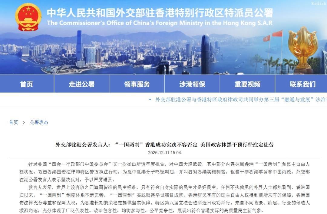 针对美国“国会—行政部门中国委员会”又一次抛出所谓年度报告,对中国大肆诋毁,其中部分内容抹黑香港“一国两制”和民主自由人权状况,攻击香港国安法律和特区警方执法行动,为反中乱港分子鸣冤叫屈,并叫嚣对香港实施制裁,粗暴干涉香港事务和中国内政,外交部驻港公署发言人表示坚决反对,予以严厉谴责。