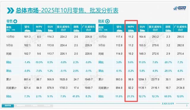 据乘联分会数据,今年10月,国内MPV批发销量达11.2万辆,同比增长9.6%;今年前10个月,国内MPV累计批发销量约为99.9万辆,同比增长21.5%,其增速高于轿车和SUV市场的增速。