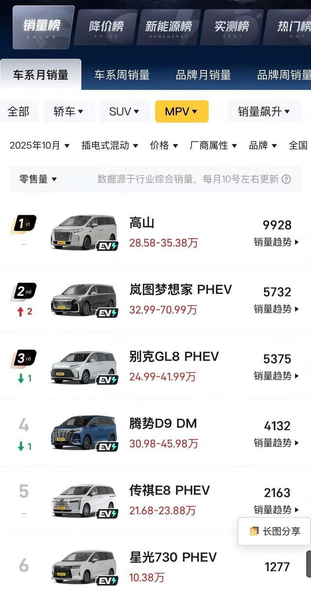其中,自主品牌新能源MPV的表现颇为亮眼。从第三方10月数据来看,在插混MPV市场中,魏牌高山(28.58万~35.38万元)销量9928辆,岚图梦想家PHEV(32.99万~70.99万元)销量5732辆,别克GL8 PHEV(24.99万~41.99万元)销量为5375辆,自主品牌占据了前两名的席位。